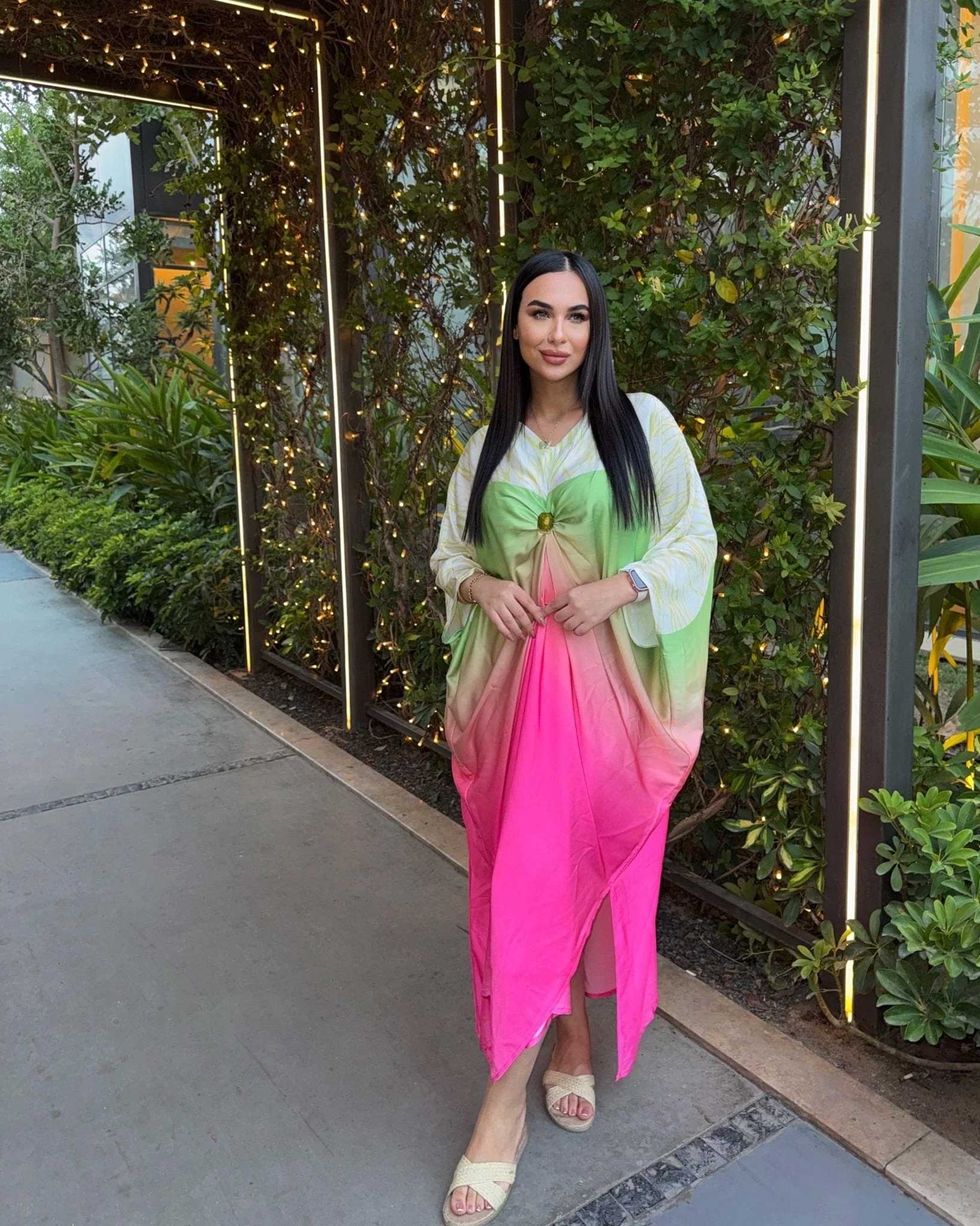 A loose bohemian-style dress made of soft satin that shimmers beautifully under the sun. Its gradient color starts with light yellow on top, blending into lime green in the middle, and finishing with vibrant pink that catches the eye. It features a chic detail at the waist with small jewel accents that add a luxurious touch. Perfect for beach or pool outings, while still being comfortable and lightly flattering to the body’s shape.