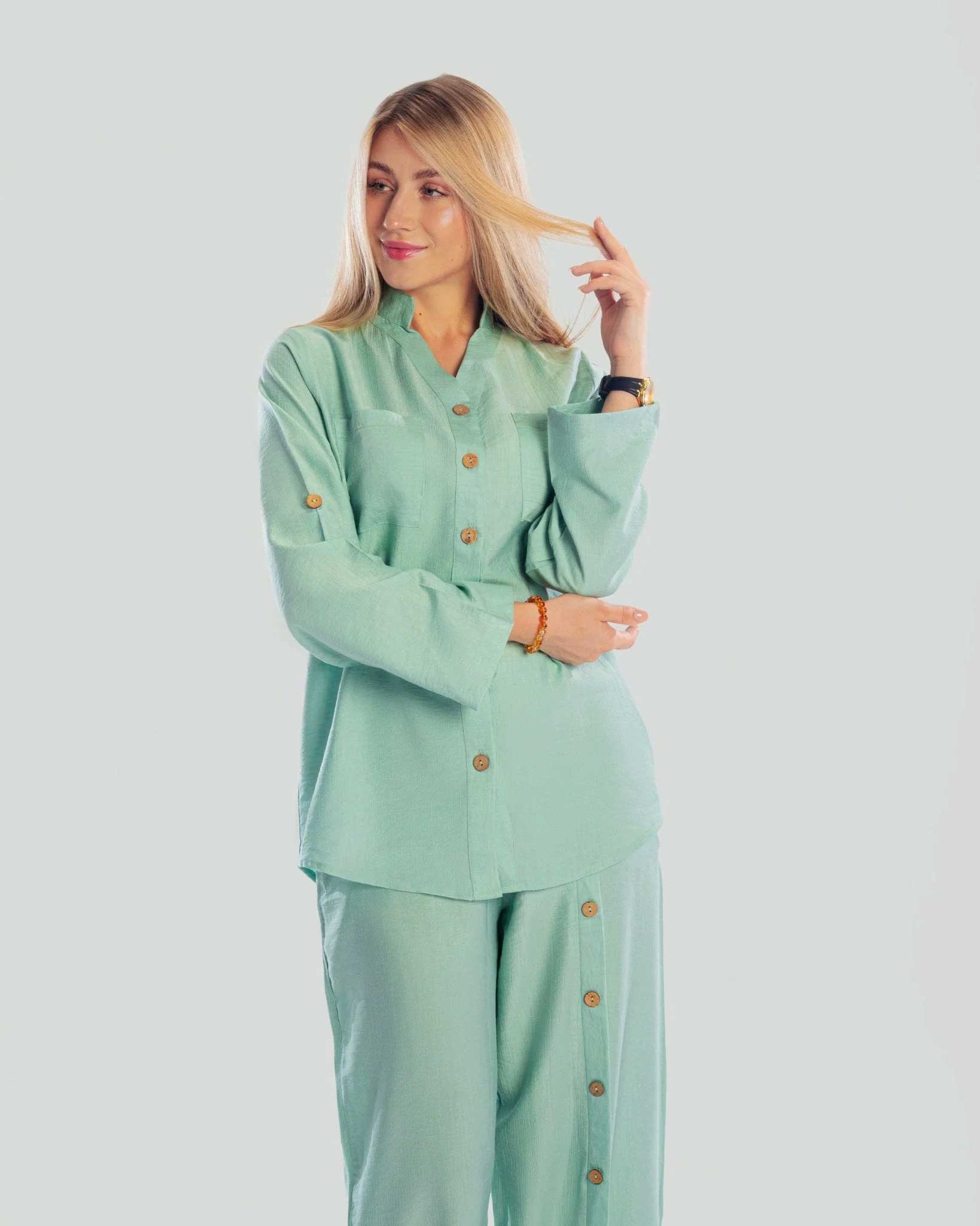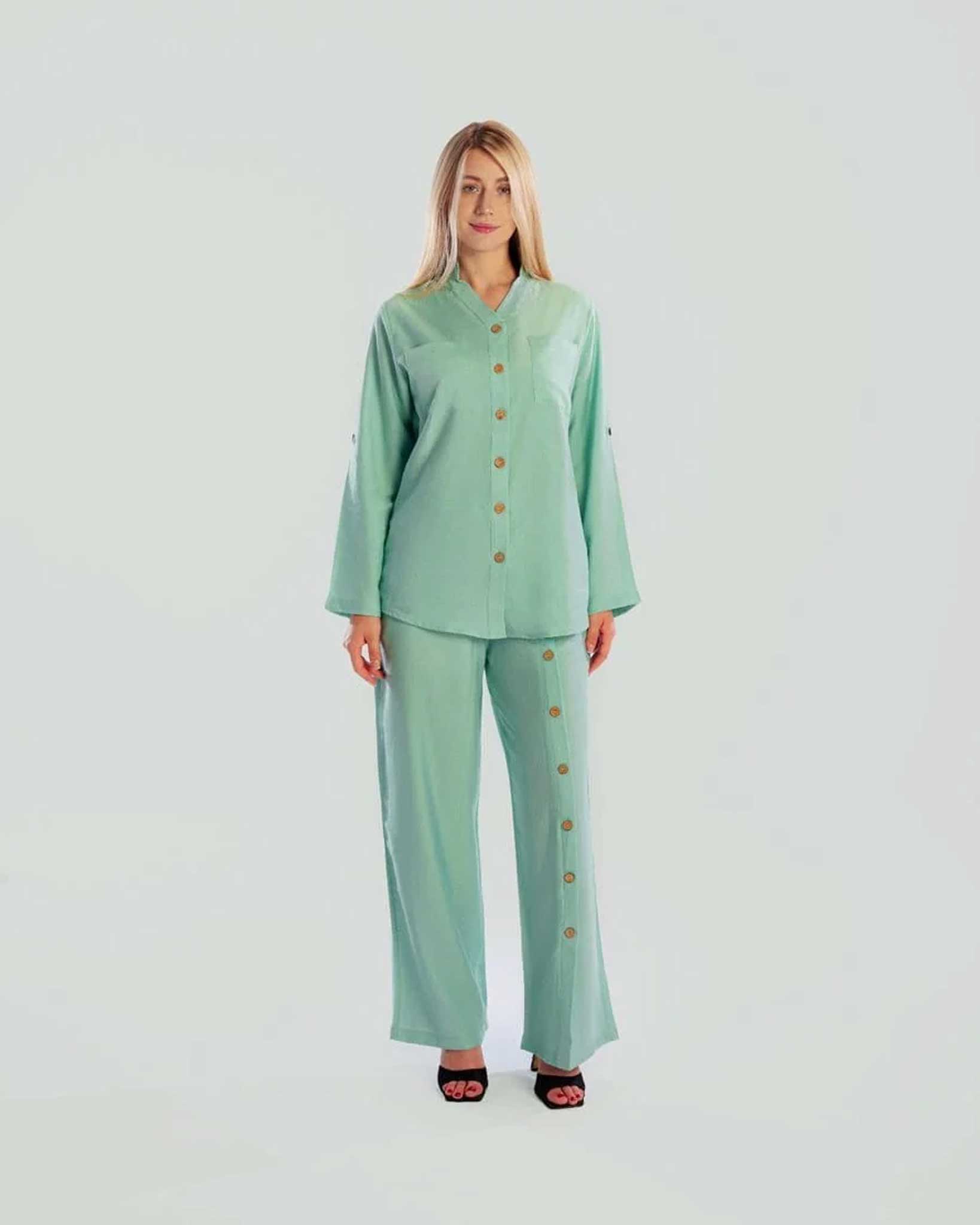 Elegant set crafted from natural cotton-linen fabric, offering a light and breathable feel perfect for summer days. Designed with a simple, practical cut that brings effortless elegance and comfort to your everyday or casual chic looks.