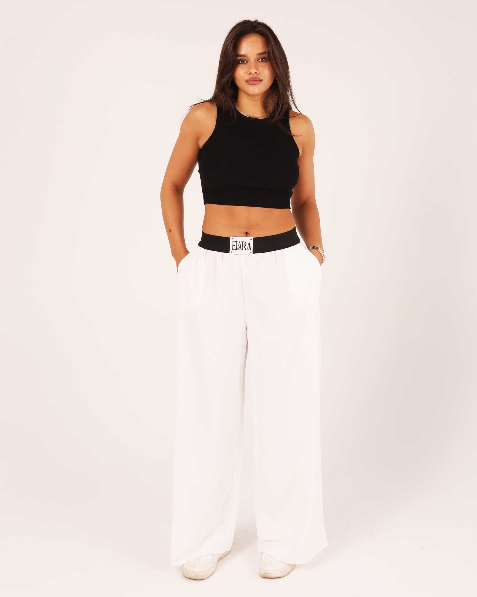 High-waisted wide-leg trousers with a comfy elastic waistband. Available in chic, versatile colors to match your mood. Styled with a sleek black crop top and fresh white kicks — this is your go-to outfit for coffee dates, mall strolls, or late-night hangouts. Effortlessly cool, endlessly Instagrammable.