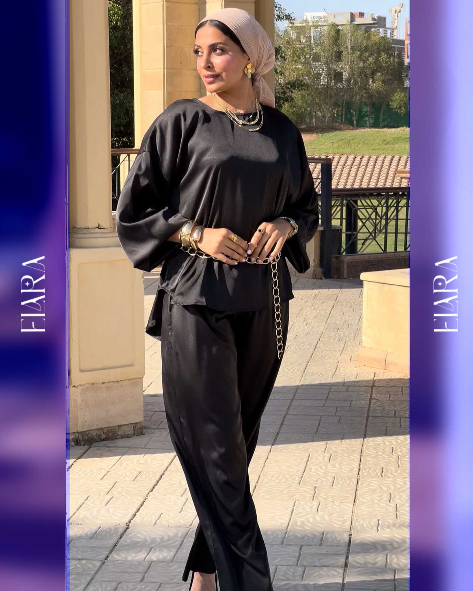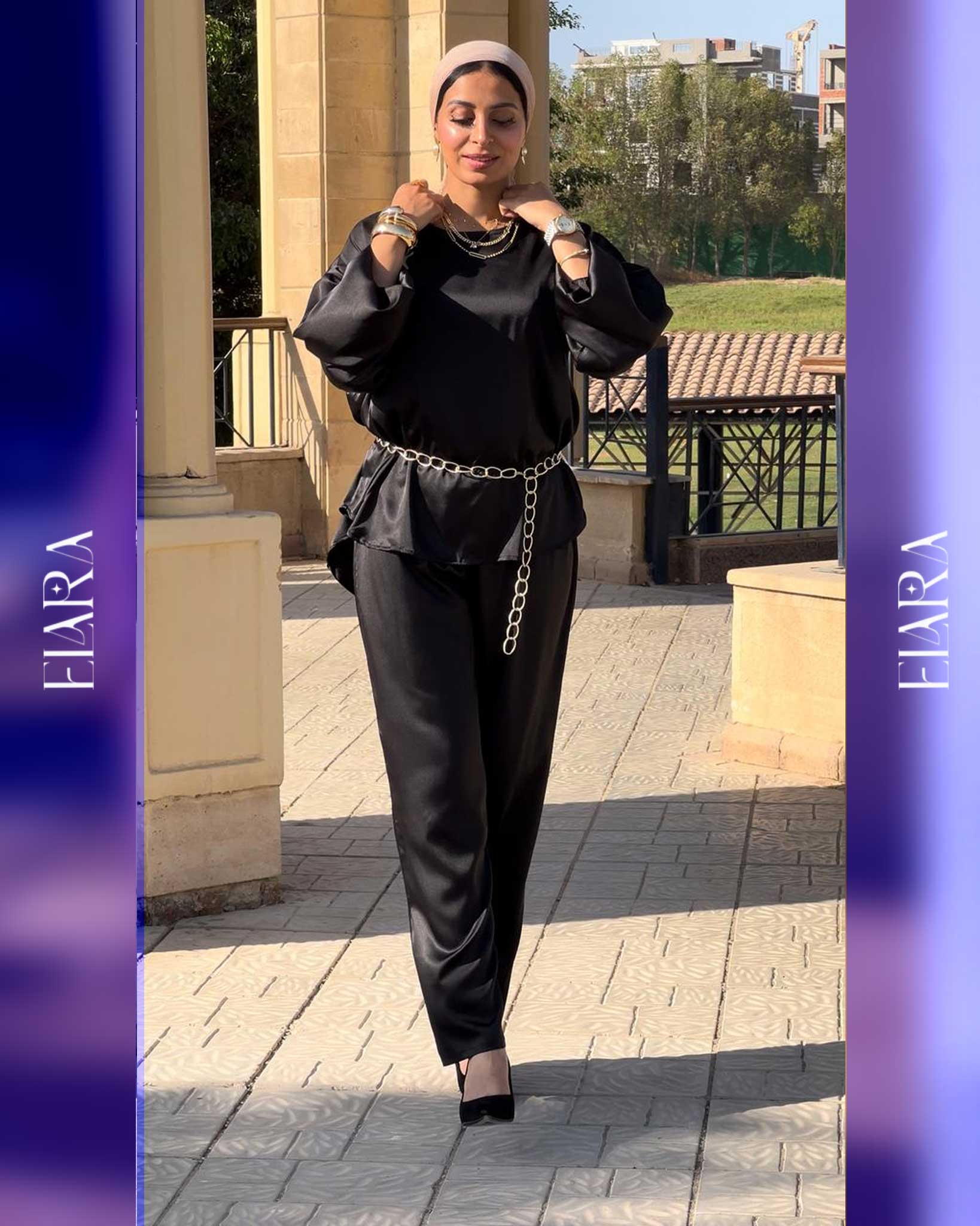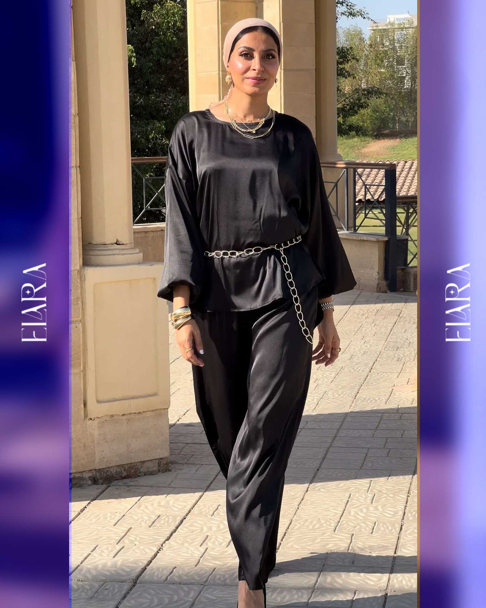 Chic two-piece set made of soft silk fabric in a luxurious black tone. Features a relaxed fit and metallic chain detail for a touch of modern elegance — perfect for evenings and special occasions.