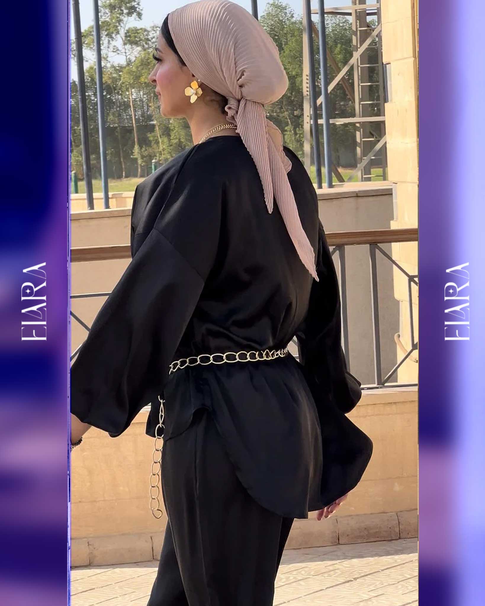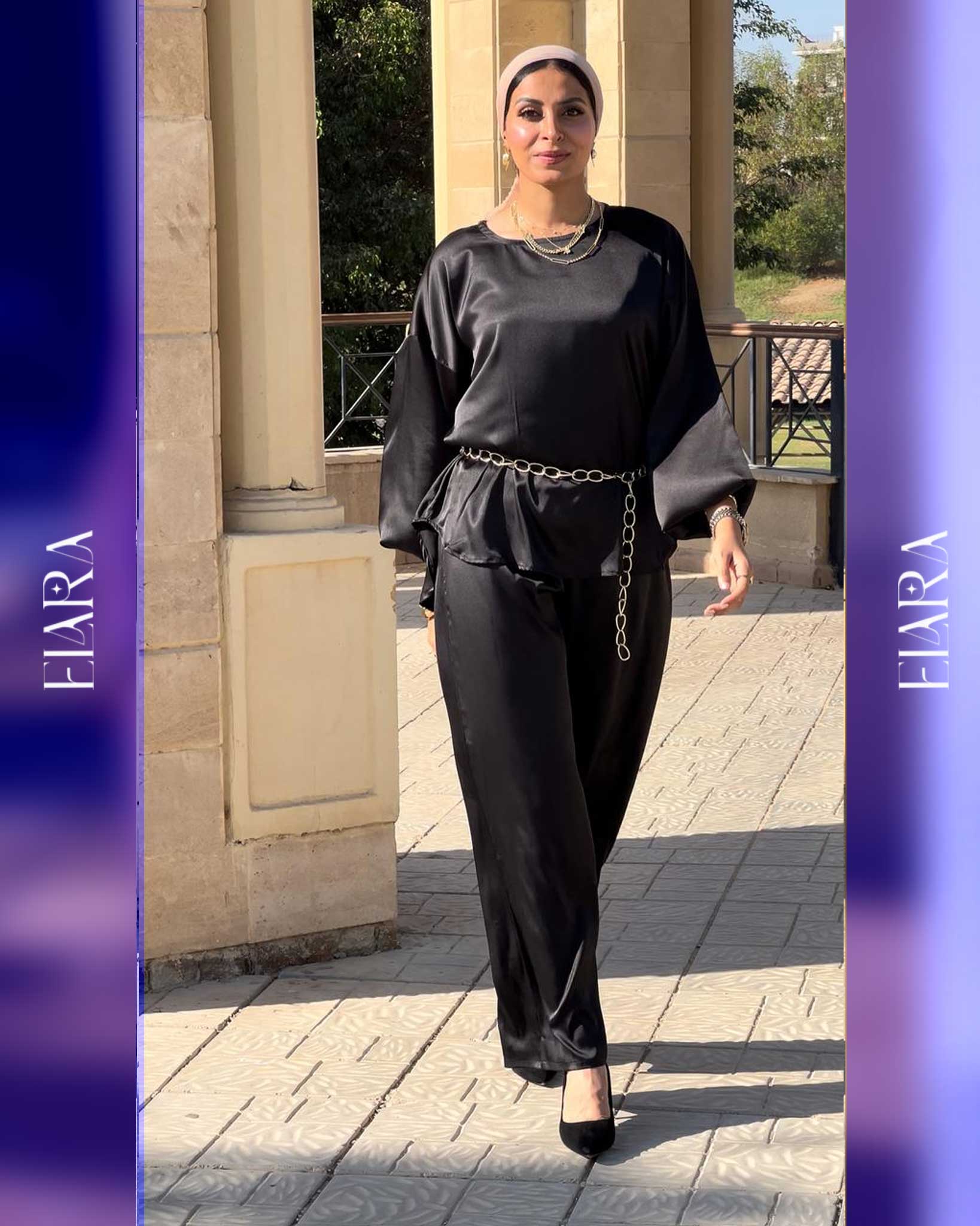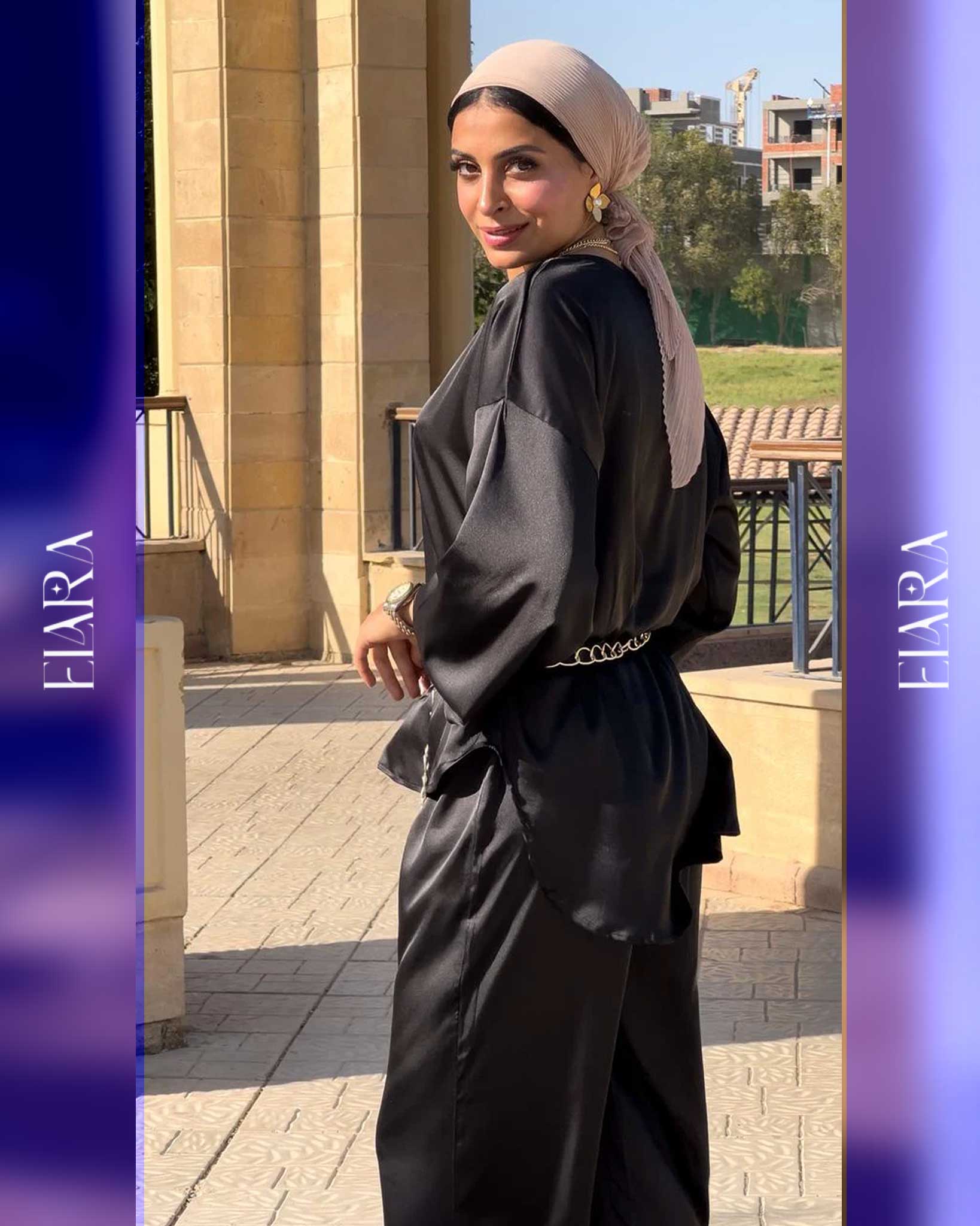 Chic two-piece set made of soft silk fabric in a luxurious black tone. Features a relaxed fit and metallic chain detail for a touch of modern elegance — perfect for evenings and special occasions.